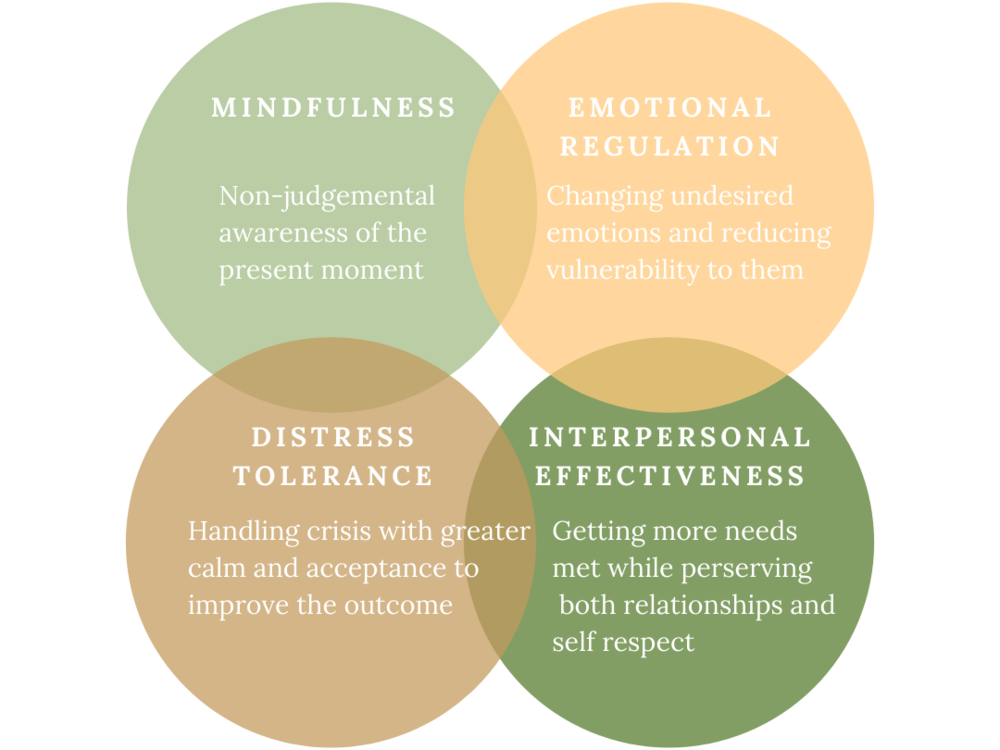 DBT skills training consists of four key components: core mindfulness, distress tolerance, emotion regulation, and interpersonal effectiveness. Its purpose is to assist you in recognizing, processing, and managing intense emotions constructively, at times reducing or preventing self-destructive behaviors such as self-harm. This approach emphasizes achieving a balance between accepting and changing challenging situations. This is done by increasing tolerance fostered by mindfulness and emotion regulation techniques. It also involves assessing relationships, with a focus on enhancing positive connections and establishing or maintaining necessary boundaries.